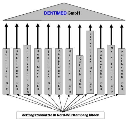 Die Vertragszahnärzte in Nord-Württemberg haben 2002 auf freiwilliger Basis die DENTIMED-Gesellschaften gegründet. Im Oktober 2002 gründeten diese 12 Gesellschaften bürgerlichen Rechts die DENTIMED GmbH und schlossen mit dieser einen Geschäftsbesorgungsvertrag ab. Die Sprecher der Geschäftsführer der 12 Gesellschaften bürgerlichen Rechts bilden den Verwaltungsrat der DENTIMED GmbH.